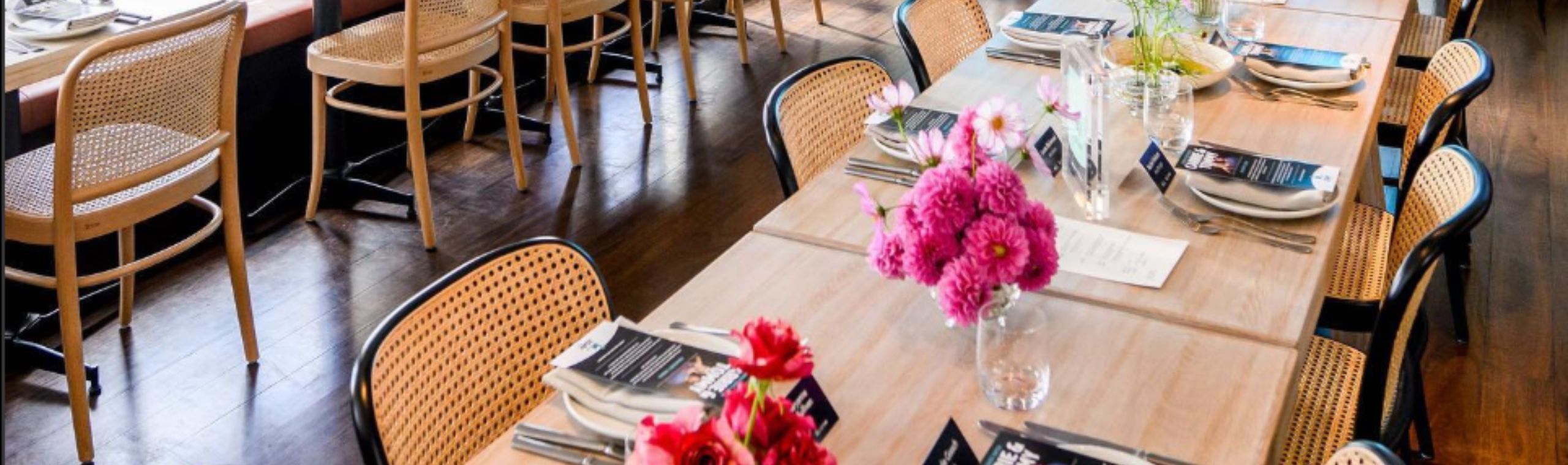 Sofia on Cleveland features a curated mix of modern and classic seating, including the elegant Hoffman Cane Back Bentwood Dining Chair and Hoffman Cane Back Bentwood Bar Stool. These pieces blend traditional design with natural textures, enhancing the relaxed yet refined aesthetic of the venue.